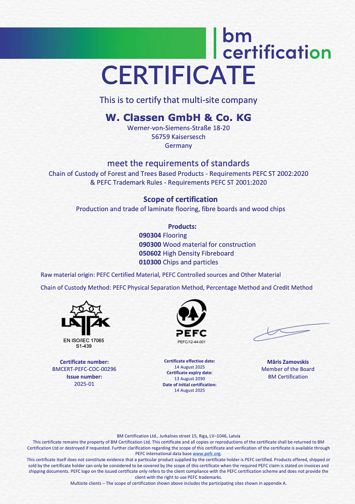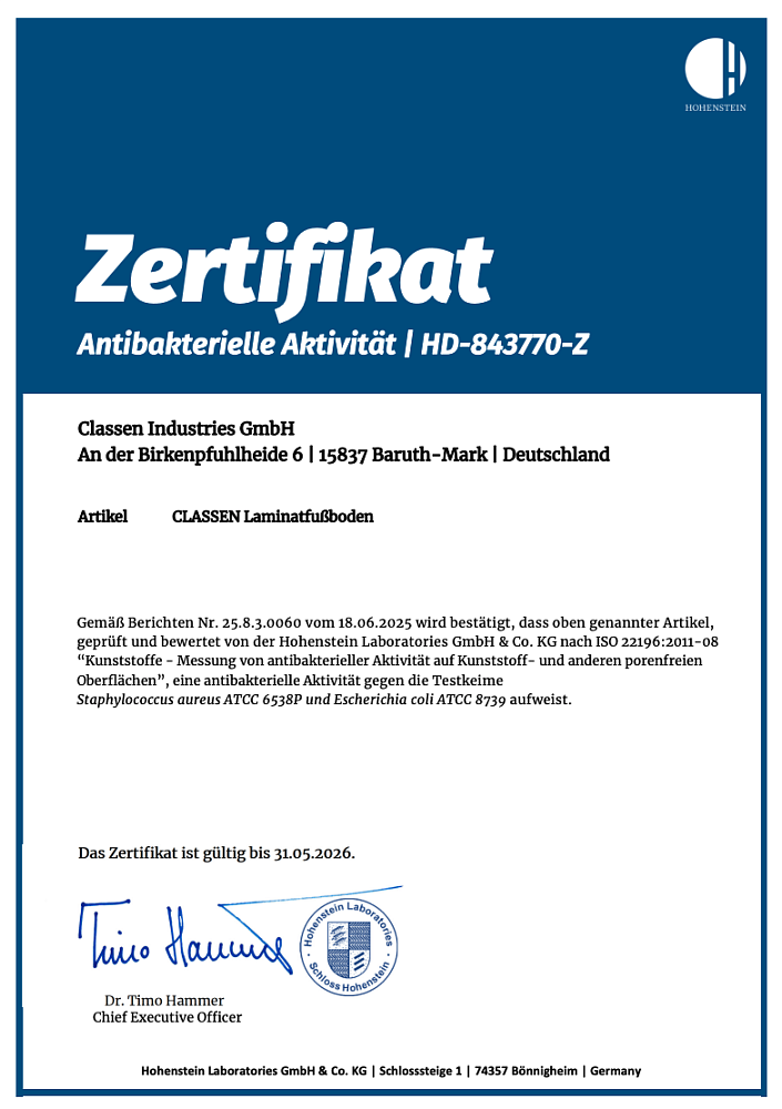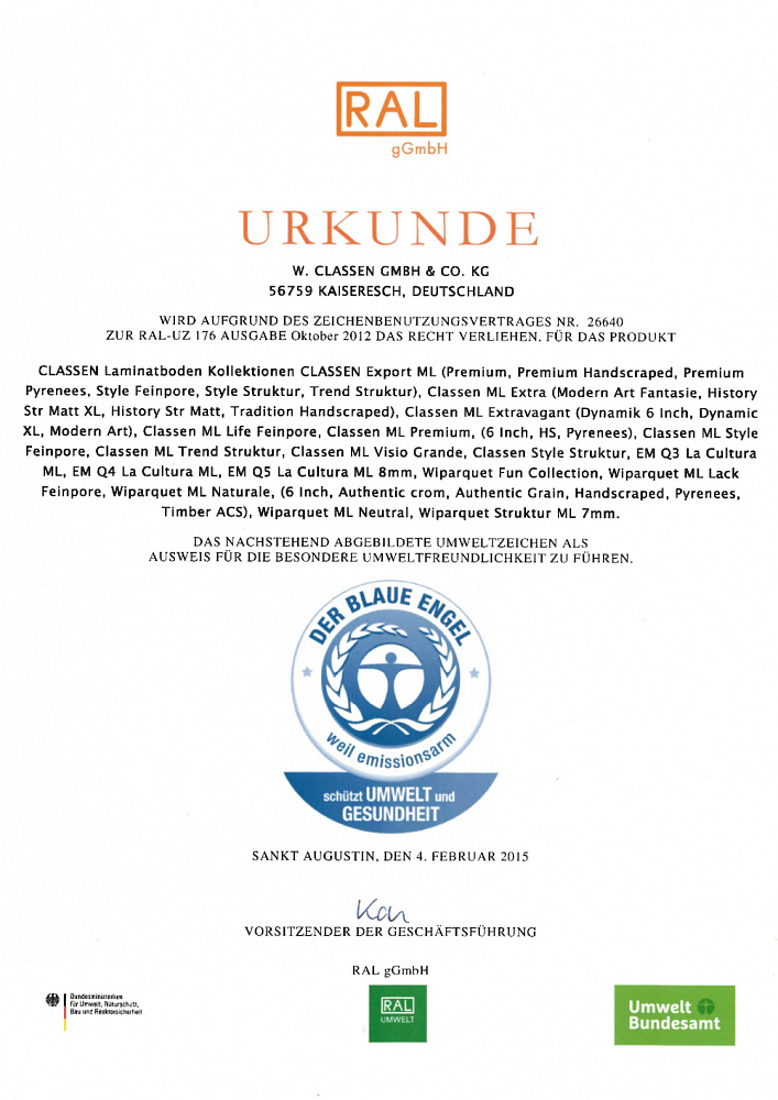 подтверждается, что ламинат Classen соответствует строгим критериям по качеству воздуха в помещении и уровню эмиссии (выделения веществ)