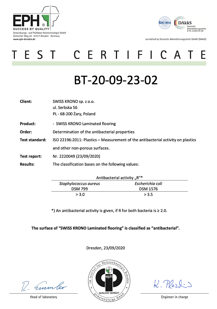 тестовый сертификат на антибактериальные свойства ламинированных полов SWISS KRONO