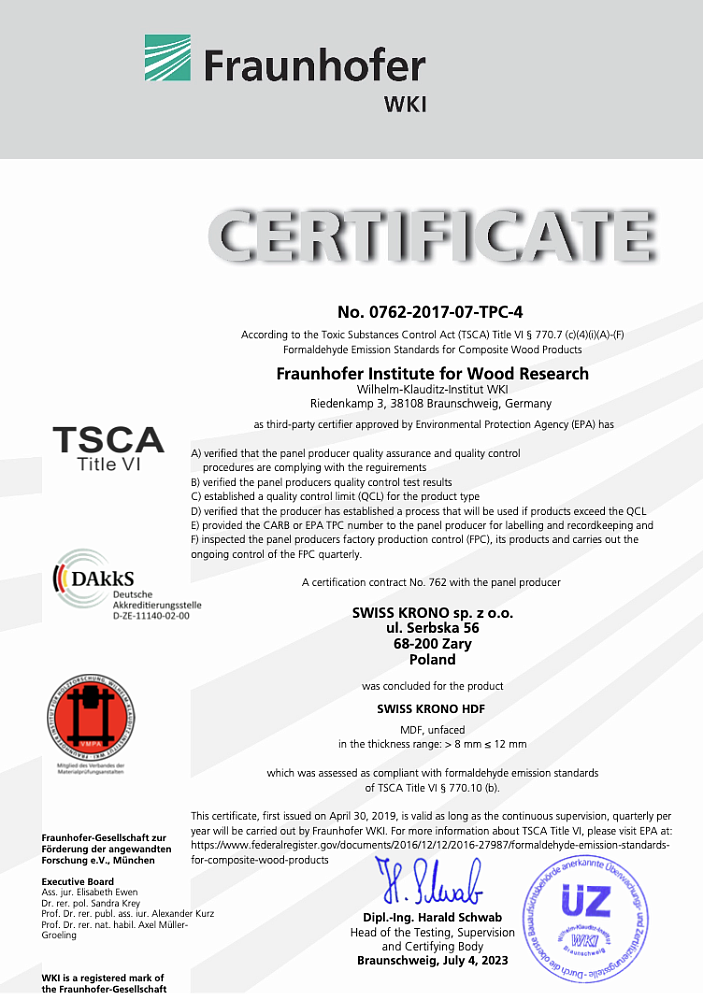 cертификат соответствия стандарту TSCA Title VI (США) по выбросам формальдегида для продукции SWISS KRONO