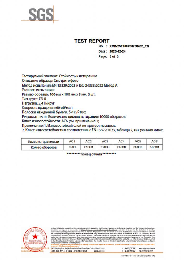10 000 оборотов абразивного диска — защитный слой не изношен. Класс AC6 по EN 13329:2023 — выше стандартного коммерческого класса 33 (AC5)