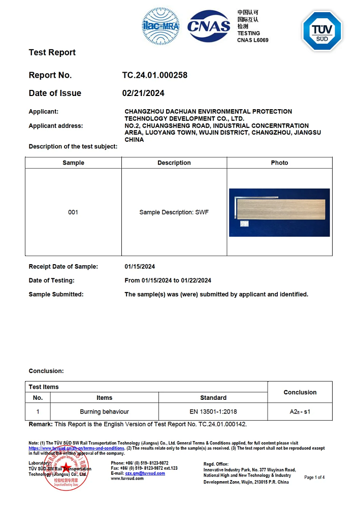Высший класс огнестойкости по европейскому стандарту EN 13501-1. Покрытие не поддерживает горение и выделяет минимум дыма — подтверждено лабораторией TÜV SÜD