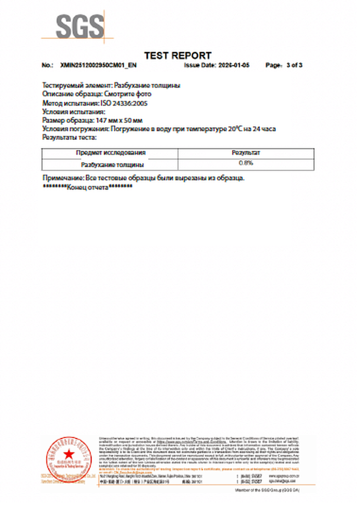 Независимые испытания SGS подтверждают: при нагреве до 80°C покрытие не деформируется и не набухает. Набухание в воде — 0.0%