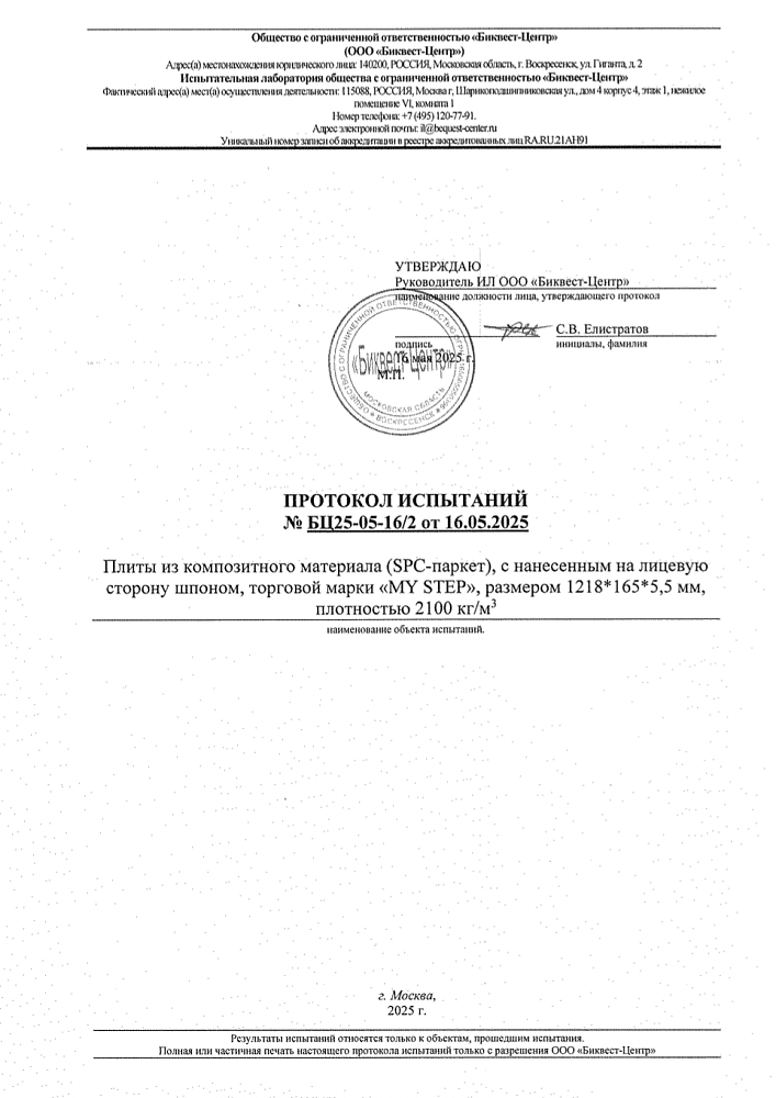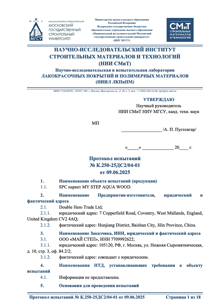 Дата получения: 09.06.2025 протокол испытаний SPC паркета в НИИ СМиТ